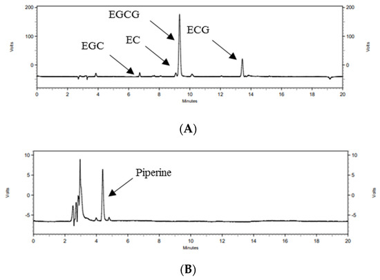 HPLC chromatogram of catechins (A) and piperine (B) in GTP. HPLC, high-performance liquid chromatography; EGC, epigallocatechin; EC, epicatechin; EGCG, epigallocatechin-3-gallate; ECG, epicatechin-3-gallate; GTP, green tea complex containing Piper retrofractum fruit.