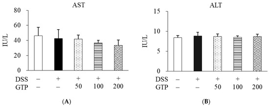 Effect of GTP on serum AST (A) and ALT (B) levels. Serum AST and ALT were measured by enzymatic colorimetric methods. Values are expressed as mean ± standard error (n = 7). GTP, green tea complex containing Piper retrofractum fruit; AST, aspartate aminotransferase; ALT, alanine aminotransaminase; DSS, dextran sulfate sodium.