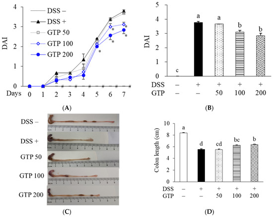 Colitis was induced with 3% (w/v) DSS (molecular mass 36,000–50,000; MP Biomedicals, Santa Ana, CA, USA) dissolved in distilled water. The mice were randomly divided into five groups (n = 7 per group): DSS− (water only; DSS-untreated normal), DSS+ (DSS only, DSS-treated control), GTP50 (DSS + 50 mg/kg GTP), GTP100 (DSS + 100 mg/kg GTP), and GTP200 (DSS + 200 mg/kg GTP). The DSS− normal group was given water for 14 days; the DSS+ control group was given water for the first 7 days and then 3% DSS for the following 7 days; the GTP groups (50, 100, and 200 mg/kg, respectively) were given GTP orally by gavage for 14 days and were simultaneously given the water containing 3% DSS starting at Day 8 (Figure 1).
