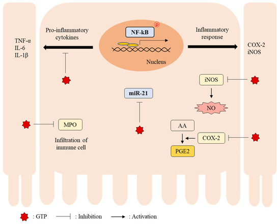 In conclusion, our results suggest that GTP alleviates DSS-induced colitis by modulating miR-21 expression and NF-κB activity in the colon. Furthermore, it was partially associated with inhibited expression of colonic pro-inflammatory cytokine genes (TNF-α, IL-1β, and IL-6) as well as iNOS and COX-2, leading to decreased NO and PGE2 production and decreased MPO activity. (Figure 7). Thus, it suggests that GTP may be used as a potentially beneficial food material for the prevention/treatment of colitis.