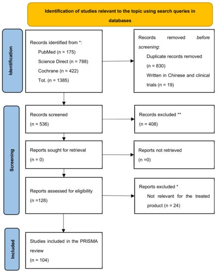 By applying the above criteria, 1385 articles dedicated to the IBS study were identified and manually screened to remove duplicates and publications inconsistent with the research aim. The funnel approach recommended by the PRISMA method for eliminating duplicates by crosschecking the title and abstract gives rise to a unique identification of 536 articles. Eligible articles were subjected to a subsequent screening phase to exclude systematic reviews based on trials and meta-analyses, non-topic trials (even if their title contained keywords from our query), drug-only veterinary trials, and the evaluation of the efficacy of prebiotics and probiotics for conditions other than IBS. Studies in which the tested probiotic strains are not explicitly stated were excluded. Finally, the four-step selection process identifies 104 studies, as summarised in the flow diagram in Figure 1.