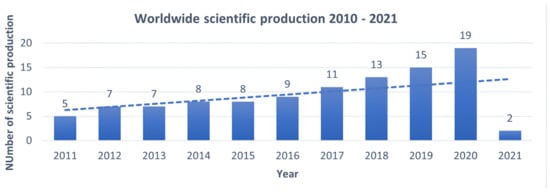 Evolution of worldwide scientific production 2011 – 2021 dedicated to evaluating the efficacy of probiotics, prebiotics, and symbiotics in treating IBS. The Y-axis shows the number of publications, the X-axis the years in which they were published. This means that interest in the topic is increasing over the years.