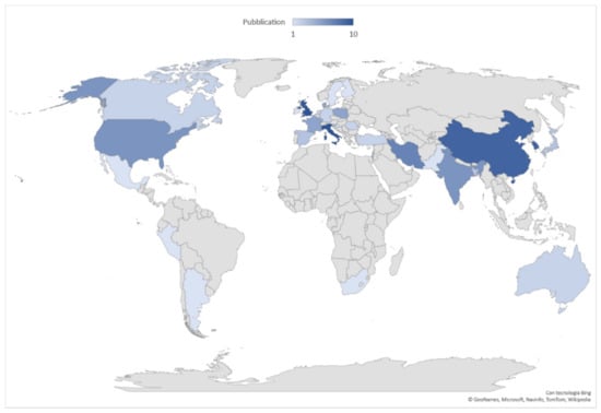 The scientific production extent, based on the origin country affiliation of the first author, is led by the United Kingdom and Italy with ten articles each, followed by China and Korea (nr. nine each), Iran (nr. seven), USA and India (nr. six each), and France, Denmark and Poland (nr. five each). The geographical distribution of publications is shown in Figure 3, where the top 10 countries account for 69% of world scientific production (nr. 72 of 104 articles).