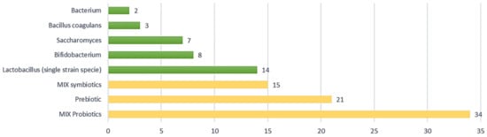 Concerning product composition, combined formulations of different probiotic strains were more prevalent than administering a single specific strain. According to the data collected, probiotics and symbiotics in mixed formulations are used in 34 and 15 studies, respectively, out of a total of 104 (approximately 47% of the studies analysed), as shown in Figure 4. Clinical trials using prebiotics, i.e., probiotics in single strains, account for 20% of the analysed studies (nr. 21) with a prevalence of Lactobacillus (nr. 14), including L. acidophilus, L. plantarum, L. reuteri, L. casei, L. gasseri, L. paracasei, L. rhamnosus, followed by Bifidobacterium (nr. 8), Saccharomyces (nr. 7), Bacillus coagulans (nr. 3), and Bacterium (nr. 2).
