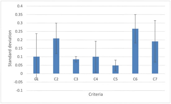 Standard deviation of individual criteria values: the criterion C1 (bloating) has the largest standard deviation; C2 (pain); C3 (cramps); C4 (flatulence); C5 (constipation); C6 (quality of life); and C7 (efficacy). The standard deviation refers to the opinion about the importance of criteria in assessing the final ranking of IBS treatments. The values that correspond to the average of the doctors’ ratings for each criterion are shown in blue. The error bar indicates the standard deviation referring to that opinion.
