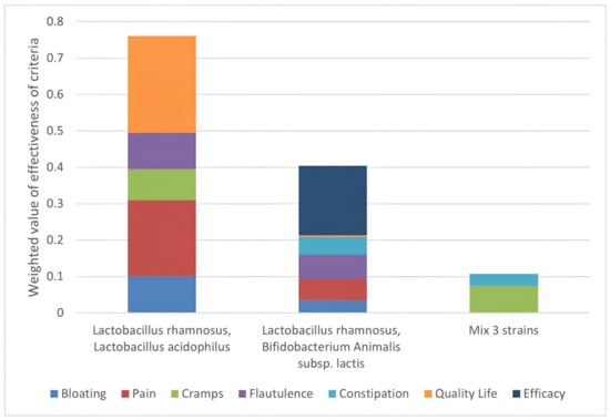 The quantitative and qualitative analysis of clinical trial data determines the efficacy of the probiotic formulations most frequently used in IBS treatment according to several criteria, including IBS symptoms and quality of life. In the present study, the MCDA allows the identification of the most effective combined formulation of different probiotic strains (probiotic mix) for IBS treatment. The different alternative strain formulations are defined as options, IBS symptoms are criteria, and finally, parameters used to measure strain performance refers to the average symptom improvement rate [].