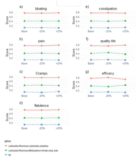 Results of the sensitivity analysis. Each graph refers to one criterion and shows how the total score for each probiotic mix changes for a 25% increase or decrease in the weight of that criterion compared to the baseline scenario. (a) C1 = bloating; (b) C2 = pain; (c) C3 = cramps; (d) C4 = flatulence; (e) C5 = constipation; (f) C6 = Quality of life; (g) C7 = efficacy.