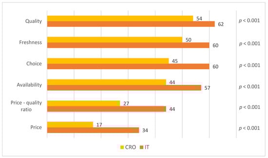 Italian consumers, in comparison with their Croatian counterparts, were more satisfied with all seafood product attributes (p < 0.001) (Figure 1). In both countries, consumers expressed the highest level of satisfaction with the quality and freshness of seafood on the market. Satisfaction with the price was, convincingly, the worst-rated in Italy and in Croatia (only 34% and 17% of consumers were satisfied, respectively). The highest obtained difference between the countries pertains to satisfaction with the price–quality ratio, with Italians (44%) being more satisfied than Croatian (27%) consumers (p < 0.001). Availability and choice are two attributes that were also significantly better-rated among Italians.
