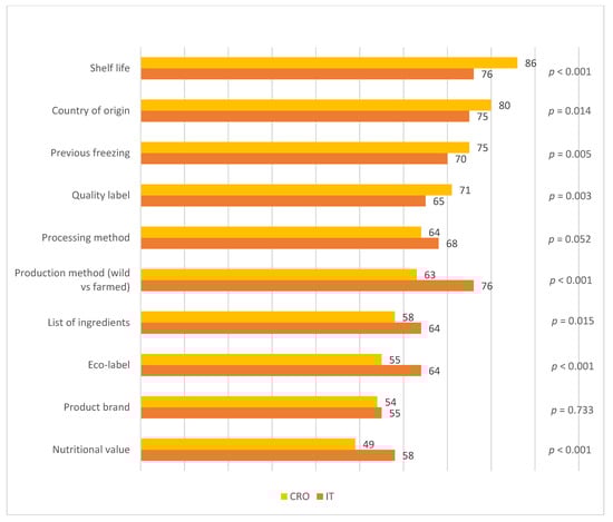 Compared with Croatians, Italian consumers reported higher importance of information on the production method. As reviewed by several authors [,], consumers generally have a greater preference for wild fish, which originates from their perception that farmed fish are of lower quality in terms of taste, nutritional value, health, and safety. The production method has also been reported previously as one of the pieces of information in which Italian consumers are most interested, together with information on whether fish has been produced sustainably []. Furthermore, a recent study outlined that many consumers belonging to the “pro-aquaculture” cluster were from Italy, which confirms their more positive perception of farmed fish in comparison with the other European consumers examined []. In this view, and accompanied by the fact that the share of aquaculture in total fishery production in Italy (41%) is significantly higher than in Croatia (24%) [], the Italians’ higher interest in the production method could be influenced, to some extent, by their search for farmed fish.