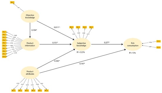 Partial least squares structural equation modelling (PLS-SEM) was used to establish valid and reliable scales for each of the constructs and to determine the causal relationships between them. Structural equation modelling (SEM) is a multivariate data analysis technique that enables researchers to incorporate unobservable variables measured indirectly by indicator variables []. PLS-SEM is a variance-based SEM method that is primarily used to develop theories in exploratory research where prior knowledge is scarce, and it is a preferred method when formative constructs are included in the structural model [,]. A theoretical model was developed to explore the influence of objective knowledge, product attributes, and product information on subjective knowledge that acts as a mediator of fish consumption behaviour.