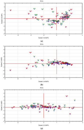 Projection of cases depending on the selected antioxidants parameters in a two-factor plane: factor 1 × factor 2 (a), factor 1 × factor 3 (b), factor 2 × factor 3 (c).