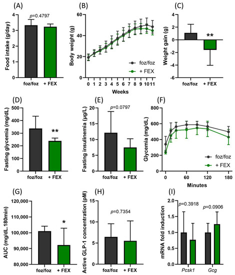 FEX poorly modulates dysmetabolic parameters in mice with NASH. (A) Mean food intake, (B) body weight evolution, (C) body weight gain over the 3 weeks of treatment, (D) fasting glycemia and (E) fasting insulinemia of foz/foz and foz/foz + FEX mice. (F) Glycemia during the OGTT performed at the end of the experiment and (G) AUC for the OGTT. (H) Plasmatic active GLP-1 concentrations 30 min after the glucose challenge. (I) Gene expression of prohormone convertase 1 (Pcsk1) and proglucagon (Gcg) in the colon of foz/foz and foz/foz + FEX mice (n = 11–13/group). Mean ± SD. Two-way ANOVA followed by post hoc Bonferroni correction; and Student’s t test. Statistical significance is represented by * p < 0.05 and ** p < 0.001.
