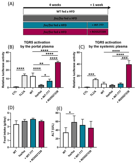 INT-777 and RO5527239 are well tolerated and reactivate TGR5. (A) After 4 weeks of HFD, foz/foz mice received an HFD containing INT-777, an HFD containing RO5527239 or a plain HFD for one additional week. HFD-fed WT mice were used as controls. (B,C) TGR5 activation by the portal or systemic plasma of WT, foz/foz, foz/foz + INT-777 or foz/foz + RO5527239 mice (n = 5–7/group) in the cell reporter assay. CTL represents the basal activation and TLCA the activation induced by tauro-lithocholic acid, which was used as a positive control. (D) Mean food intake. (E) ALT levels in systemic plasma of WT, foz/foz, foz/foz + INT-777 or foz/foz + RO5527239 mice. Mean ± SD. One-way ANOVA followed by post hoc Bonferroni correction. Statistical significance is represented by * p < 0.05; ** p < 0.01; *** p < 0.001 and **** p < 0.0001. All p-values < 0.05 are represented on the graphs, while p-values > 0.05 are not.