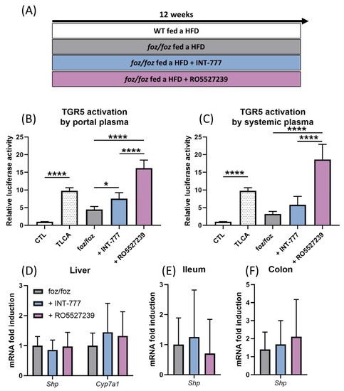 INT-777 and RO5527239 stimulate TGR5 signaling with no effect on FXR signaling. (A) Foz/foz mice were fed for 12 weeks an HFD supplemented with INT-777 or with RO5527239; then, they were compared to foz/foz and WT mice fed an HFD for 12 weeks. (B,C) TGR5 activation by the portal or systemic plasma of WT, foz/foz, foz/foz + INT-777 or foz/foz + RO5527239 mice in the cell reporter assay. CTL represents the basal activation and TLCA represents the activation induced by tauro-lithocholic acid, which was used as a positive control. (D–F) Expression of FXR target genes in the liver, ileum and colon of WT, foz/foz, foz/foz + INT-777 and foz/foz + RO5527239 mice (n = 7/group). Mean ± SD. One-way ANOVA followed by post hoc Bonferroni correction. Statistical significance is represented by * p < 0.05 and **** p < 0.0001. All p-values < 0.05 are represented on the graphs, while p-values > 0.05 are not.