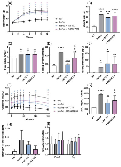 INT-777 and RO5527239 improve glucose tolerance in a GLP-1-independent manner. (A) Body weight evolution, (B) body weight gain over the 12 weeks, (C) mean food intake, (D) fasting glycemia and (E) fasting insulinemia of WT, foz/foz, foz/foz + INT-777 and foz/foz + RO5527239 mice (n = 7/group). (F) Glycemia during the OGTT performed at the end of the experiment and (G) AUC for the OGTT. (H) Total GLP-1 concentrations in systemic plasma 15 min after a glucose challenge. (I) Gene expression of Pcsk1 and Gcg in the colon of WT, foz/foz, foz/foz + INT-777 and foz/foz + RO5527239 mice (n = 7/group). Mean ± SD. One- or two-way ANOVA followed by post hoc Bonferroni correction. Statistical significance is represented by * p < 0.05; ** p < 0.01; *** p < 0.001 and **** p < 0.0001 when compared to WT; # p < 0.05; ## p < 0.01; and #### p < 0.001 when compared to foz/foz; and & p < 0.05 when compared to foz/foz + INT-777. For (A,F), colors are used to indicate the corresponding group. All p-values < 0.05 are represented on the graphs, while p-values > 0.05 are not.