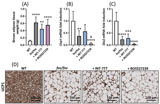 RO5527239, but not INT-777, increased the TGR5 activation capacity of systemic plasma (Figure 4C). Thus, we anticipate that RO5527239, but not INT-777, would stimulate thermogenesis in the brown adipose tissue of foz/foz mice. As previously described [29,30], HFD-fed foz/foz mice had an impaired brown adipose thermogenesis, as shown by a higher weight of the tissue and lower uncoupling protein 1 (Ucp1) and iodothyronine deiodinase 2 (Dio2) gene and UCP1 protein expression compared to their HFD-fed WT controls (Figure 6A–D). Surprisingly, the treatment with RO5527239 did not change weight and lipid content in the brown adipose tissue nor the UCP1 protein expression (Figure 6A,D). RO5527239 did not increase Ucp1 and Dio2 mRNA expression (Figure 6B,C). As expected, the brown adipose weight, as well as the gene and protein expressions of Ucp1 and Dio2, were not significantly modified by treatment with INT-777 (Figure 6A–D). In conclusion, the high TGR5 activation capacity of systemic plasma in RO5527239-treated foz/foz mice did not stimulate systemic effects such as thermogenesis.