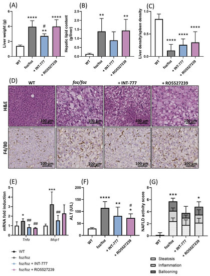 INT-777, but not RO5527239, partially improves NASH. Liver (A) weight, (B) lipid content, (C) density (normalized to spleen density). (D) Representative H&E and F4/80 staining of liver sections (bar size: 100 µm). (E) Hepatic gene expression of Tnfα and Mcp1, (F) plasmatic ALT levels and (G) NAFLD activity score [1] of WT, foz/foz, foz/foz + INT-777 and foz/foz + RO5527239 mice (n = 7/group). Mean ± SD. One-way ANOVA followed by post hoc Bonferroni correction. Statistical significance is represented by * p < 0.05; ** p < 0.01; *** p < 0.001 and **** p < 0.0001 when compared to WT; and # p < 0.05; ## p < 0.001 when compared to foz/foz. All p-values < 0.05 are represented on the graphs, while p-values > 0.05 are not.