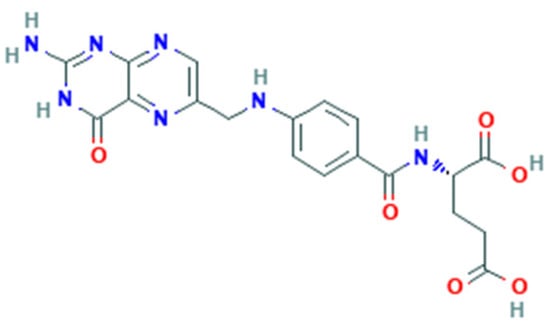 Folate-dependent biochemical processes are influenced by the form and bioavailability of folate [22]. Folate is a generic term for vitamin B9 that includes several forms, including that naturally found in food (natural folate). All folate forms have a common structure but differ based on the pteridine ring and whether it is reduced or oxidized [23]. Folate derived from food such as leafy green vegetables are polyglutamates (Figure 1), whereas synthetic FA is a monoglutamate (Figure 2) [21].