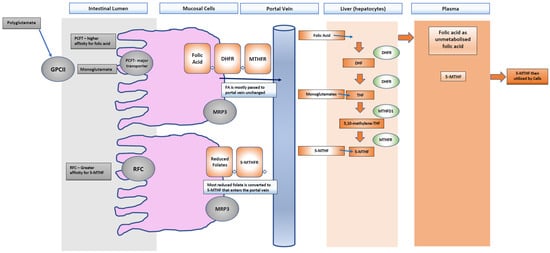 Food folate is naturally present in foods such as leafy green vegetables and is in a reduced form [13]. This natural folate exists in a polyglutamate form and needs to be further hydrolyzed to a monoglutamate form by the intestinal lumen to be transported [24]. The intestinal absorption of polyglutamate derivatives of tetrahydrofolate (THF) into monoglutamates is carried out by the brush border enzyme glutamate carboxypeptidase II (GPCII) [25]. This crossing of the apical brush border is carried out via two transporters, the proton-coupled folate transporter (PCFT) and the reduced folate carrier (RFC) [26,27]. Most of the absorbed natural folate is metabolized to 5-methyltetrahydrofolate (5-MTHF) in the intestine and/or liver [26] because the RFC has a higher affinity for reduced folates such as 5-MTHF compared to FA [26]. The fate of both natural folate and FA is to be metabolized to 5-MTHF [28]. The RFC transporter is found throughout the intestinal tract and is highly expressed in the liver and placenta [26]. The PCFT’s key role is as the major transporter of dietary folate in the proximal small intestine, specifically in the brush border of the duodenum and jejunum and has an optimal function with an acidic PH but has a higher affinity to FA than it does to reduced folates such as 5-MTHF [16,26,29,30]. Once absorbed by the RFC or PCFT, the folate is transported into the hepatic portal vein by multidrug resistance-associated protein 3 (MRP3) and then to the liver, where it is taken up via hepatocytes [26]. The intestine can convert reduced folates to 5-MTHF quite well; however, it is the first-pass metabolism and intestinal absorption where the difference between the metabolism of FA and the reduced folate forms exists as its reduction and methylation are dose dependent [14,28].