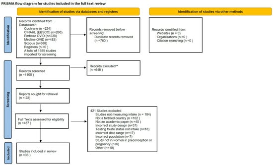 Figure 4 presents the flowchart of study selection and inclusion. A total of 1885 studies were identified. After removing duplicates (n = 780) and excluded citations by title and abstract (n = 648), 457 full-text studies were assessed for eligibility. Of those, 421 were excluded because they were either not measuring folate intake, not from a country that had a mandatory fortification policy, not an academic paper, or had an incorrect study design or date range. This left a total of 36 studies for inclusion.