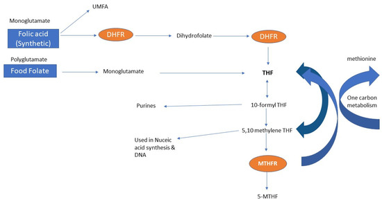 Folate metabolism leading to one carbon metabolism—the end goal is for folates to be metabolized to 5-MTHF, where it is used by methionine synthase reductase (MTR) for one carbon metabolism and methylation reactions: 5-MTHF = 5-methyltetrahydrofolate reductase, DHFR = dihydrofolate reductase, THF = tetrahydrofolate, MTHFR: methylenetetrahydrofolate reductase, and UMFA: unmetabolized folic acid.