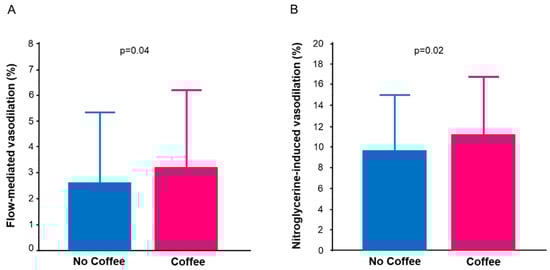 Endothelium cells maintain endothelial function by secreting several vasodilators such as nitric oxide (NO) and endothelium-derived hyperpolarizing factor [,]. Endothelial function is impaired by cardiovascular risk factors in the initial step of atherosclerosis [,,,], and vascular smooth muscle function is impaired in the progressed state of atherosclerosis []. Measurement of flow-mediated vasodilation (FMD) in the brachial artery is the most popular tool for assessing endothelial function and measurement of nitroglycerine-induced vasodilation (NID) is the most popular tool for assessing vascular smooth muscle function [,]. Both FMD and NID are associated with cardiovascular risk factors, are targets for the treatment of cardiovascular disease, and are predictors for cardiovascular events. Although previous studies have shown that FMD and NID are correlated with daily lifestyle habits including smoking, tooth brushing, and daily physical activity [,], the effects of coffee intake on vascular function are still controversial. Several interventional studies have shown acute beneficial effects of coffee intake on vascular function [,], while some studies showed no effect [,] or harmful effects on vascular function [,].