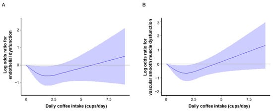 Finally, we assessed the effects of the amount of coffee intake on endothelial function by cubic spline curves. The cubic spline curves revealed that a daily intake of 0.5 cups to 2.5 cups of coffee had lower odds ratios for endothelial dysfunction and vascular smooth muscle dysfunction (Figure 2A,B).