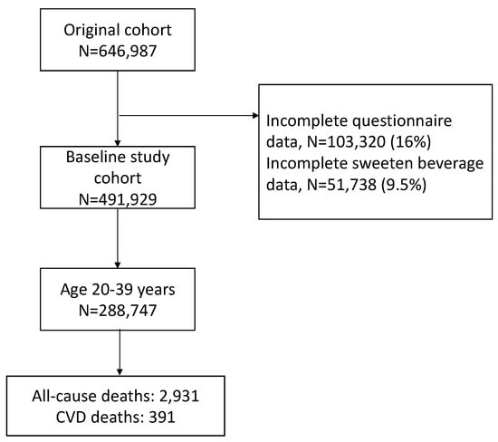 We conducted this prospective study with 288,747 participants aged 20–39 from a self-paid medical screening program to assess the association between CVD mortality and SSB intake among younger adults. In considering the high likelihood of classifying CVD mortality as death from diabetes in patients with diabetes or as death from kidney disease in patients with kidney disease, we also calculated the mortality risks of expanded CVDs as a sensitivity analysis by including the registered mortalities related to CVDs, diabetes, or kidney diseases [].
