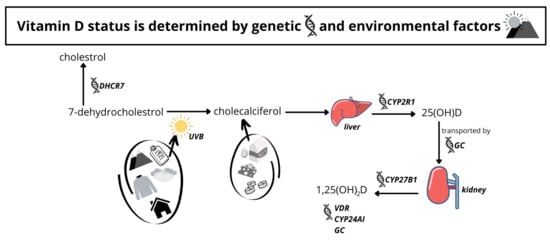 Production in the skin following sun exposure accounts for approximately 80% or more of vitamin D in humans on average, with the remainder ingested in the form of food or supplements. Dermal vitamin D production is dependent on environmental factors (e.g., season and latitude), and personal factors such as skin type and surface area exposed, including genetic make-up [,,]. Figure 1 illustrates the vitamin D pathway. When the skin is exposed to ultraviolet B (UVB) radiation, in a photochemical reaction 7-dehydrocholesterol (7-DHC) is converted to previtamin , which spontaneously transforms into vitamin (cholecalciferol). Vitamin is next processed in the liver to 25-hydroxyvitamin D (25(OH)D), the major circulating form and the standard biomarker of vitamin D status [,].