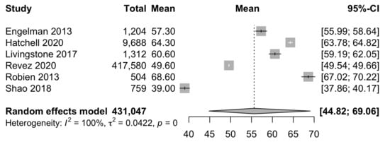 For each eligible study, two researchers (LZ and RS) independently extracted and recorded the following data in Covidence: publication characteristics (including author, journal, publication date), study details (including design, type, aim, sample size, population characteristics, environmental exposure measures), and outcome measures (including vitamin D levels, effect size estimates). Quality assessment was performed following the Newcastle–Ottawa Scale for cohort studies (all of the included studies were cohort studies; ref. []). By assessing the GxE pairs studied to date, we found no two studies that investigated the same interaction. Thus, we were unable to conduct a meta-analysis of GxE interaction effects. Nonetheless, we summarise and present the effects of GxE on 25(OH)D reported in the literature and describe the different approaches used to study them, including the various genetic variants, environmental proxies, and effect measures used to date. The pooled mean 25(OH)D concentration across the included studies was assessed using the R package meta []. Given the considerable between-study heterogeneity, a random-effects model was used to pool 25(OH)D estimates. The restricted maximum likelihood estimator was used to calculate the heterogeneity variance and the Knapp–Hartung adjustments to calculate the confidence interval around the pooled mean [,]. Two studies were conducted using the same cohort, the UK Biobank. We present both, but when synthesising results we keep Revez et al. [] (N = 318,851) and exclude the smaller one, Manousaki et al. [] (N = 193,809).