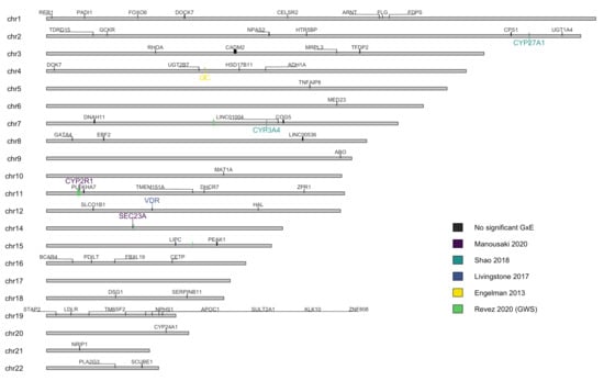 GC encodes a vitamin D binding protein (also known as Group-specific Component) that binds to and transports vitamin D and was examined in 4 studies ([,,,]. Robien et al. [] did not find evidence for interaction between the GC haplotype and hours spent sitting at work (p-value = 0.24). However, Engelman et al. [] reported a significant interaction (p-value = 0.01) for rs7041, a SNP within GC, where the b-coefficient for the high-exposure group was almost sixteen times that in the low-exposure group (stratified by winter/summer, −0.33 vs. −0.02, respectively). There was no evidence for interaction in the other GC SNP, rs4588 (p-value = 0.17, ref. []). Neither Revez et al. [] nor Manousaki et al. [] found evidence for interaction in their selected SNPs in this gene (corrected , , respectively), including rs4588 (to which rs1352846 from [] and rs11723621 from [] are in complete LD (r2 and D’ > 0.99, ref. []).