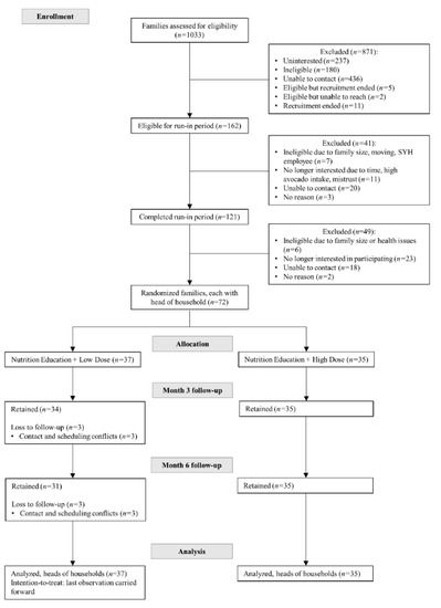 - Pacheco, L.S.; Bradley, R.D.; Denenberg, J.O.; Anderson, C.A.M.; Allison, M.A. Effects of Different Allotments of Avocados on the Nutritional Status of Families: A Cluster Randomized Controlled Trial. Nutrients 2021, 13, 4021. [Google Scholar] [CrossRef] [PubMed]