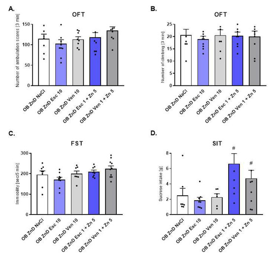 The effects of antidepressants (Esc (Escitalopram), Ven (Venlafaxine)) and Zn supplementation on rats subjected to the OB + ZnD model in the OFT (A,B), FST (C), and SIT (D). Data were analyzed using a one-way ANOVA and the Newman–Keuls multiple comparisons test. # p < 0.05 vs. OB ZnD NaCl. Values are expressed as mean ± SEM (n = 7–10).