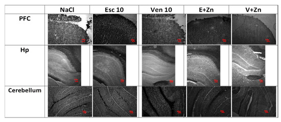 As shown in Table 4, chronic treatment with 10 mg/kg of Esc and Esc (1 mg/kg), Zn (5 mg/kg), and 10 mg/kg Ven or Ven (1 mg/kg) and Zn (5 mg/kg) increased synaptic zinc levels in the PFC [F(4, 14) = 5.616; p = 0.124] compared to the OB ZnD NaCl group. In the cerebellum, chronic treatment with 10 mg/kg of Ven; Esc (1 mg/kg) and Zn (5 mg/kg) and Ven (1 mg/kg) and Zn (5 mg/kg), but not Esc increased synaptic zinc levels [F(4, 19) = 9.697; p= 0.0004] compared to the OB ZnD NaCl group. In the Hp we did not observe any effects after chronic treatment with antidepressants and Zn supplementation [F(4, 11) = 0.1760; p > 0.05].