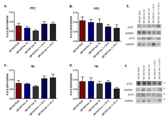 Our present studies showed a significant decrease in ZnT1 protein levels in the PFC and Hp of OB + ZnD rats compared with animals that received a zinc-adequate diet and were subjected to OB. Similarly, we observed dysregulation of ZnT3 in the Hp with no changes in the PFC. Chronic administration of Esc/Ven or Esc/Ven (inactive dose) and Zn had no effects on ZnT levels in the PFC or Hp.