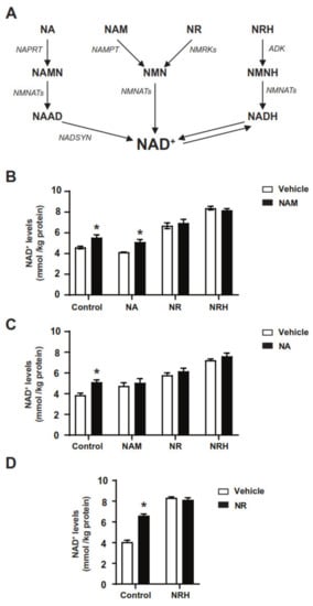 - Hara, N.; Yamada, K.; Shibata, T.; Osago, H.; Hashimoto, T.; Tsuchiya, M. Elevation of Cellular NAD Levels by Nicotinic Acid and Involvement of Nicotinic Acid Phosphoribosyltransferase in Human Cells. J. Biol. Chem. 2007, 282, 24574–24582. [Google Scholar] [CrossRef] [Green Version]