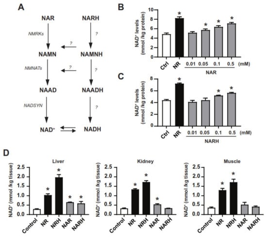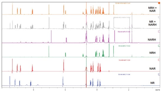 - Giroud-Gerbetant, J.; Joffraud, M.; Giner, M.P.; Cercillieux, A.; Bartova, S.; Makarov, M.V.; Zapata-Pérez, R.; Sánchez-García, J.L.; Houtkooper, R.H.; Migaud, M.E.; et al. A reduced form of nicotinamide riboside defines a new path for NAD+ biosynthesis and acts as an orally bioavailable NAD+ precursor. Mol. Metab. 2019, 30, 192–202. [Google Scholar] [CrossRef] [PubMed]