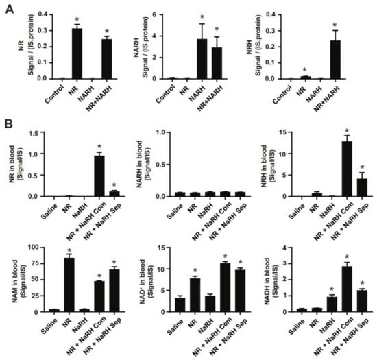 - Trammell, S.A.J.; Schmidt, M.S.; Weidemann, B.J.; Redpath, P.; Jaksch, F.; Dellinger, R.W.; Li, Z.; Abel, E.D.; Migaud, M.E.; Brenner, C. Nicotinamide riboside is uniquely and orally bioavailable in mice and humans. Nat. Commun. 2016, 7, 12948. [Google Scholar] [CrossRef] [Green Version]