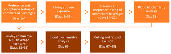 The experiment was conducted across two phases. Phase 1 was designed to assess preference and acceptance of test drinks and determine if a period of sucrose exposure will affect palatability and behavioural responses. Phase 2 switched experimental groups from sucrose to their assigned test drinks to assess the levels of potential metabolic recovery. The timeline of all the procedures is shown in Figure 1. BW was measured every three days during sucrose and NNS exposure, fluid intake—daily.