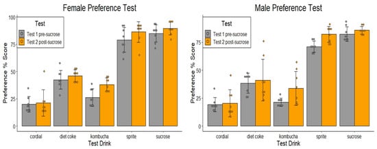 Analysis of the preference scores found the main effect, indicating there was a significant difference for the test drink groups (female: F(4,35) = 94.10, p < 0.001; male: F(4,35) = 167.58, p < 0.001). Pairwise comparisons (Tukey’s HSD correction) revealed female preference for sucrose and Sprite was significantly higher than all other conditions (ps < 0.001), but did not differ from each other (p > 0.05), whereas in male rats, sucrose preference was greater than that for Sprite (p < 0.024). In both sexes, the preference scores for Diet Coke were greater than for Cordial and Kombucha (ps < 0.001), with no difference detected in the latter two conditions in either sex, F > 1.
