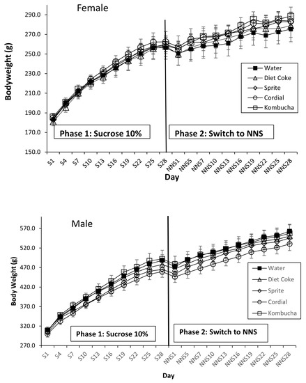 As for other secondary metabolic measures, blood marker results demonstrate only the rats that continued to drink sucrose for a further 4 weeks, albeit at a reduced concentration (i.e., the Sprite group), showed an increase in fasting blood glucose levels in both sexes. For females, this value was higher than in all the other groups, suggesting the detrimental effect of sucrose was even greater. Unfortunately, female plasma insulin samples could not confirm this. Gender differences in blood glucose and plasma insulin levels have been reported, with females more susceptible to poorer outcomes []. Male insulin data were inconsistent, with the Sprite group higher than controls but not differing from other groups that switched to NNS beverages. This suggests the model of changing from sucrose to diet drinks does not mediate recovery in males, although there is the possibility we did not have adequate power to conclude this result. A secondary consideration is whether recovery in rats was not achieved due to NNS adversely effecting metabolism; however, the possibility is reduced due to low intake volumes in the Kombucha and Cordial groups. Some studies have reported changes to the gut microbiome following NNS consumption, which may be associated with poor glycaemic outcomes [,], whereas others have contradicted this []. We cannot confirm or refute this result as it was outside the scope of our research aims. Moreover, a limitation of this current study is the lack of inclusion of a water/chow group, so determination of sucrose-induced metabolic damage during Phase 1 could not be presented.