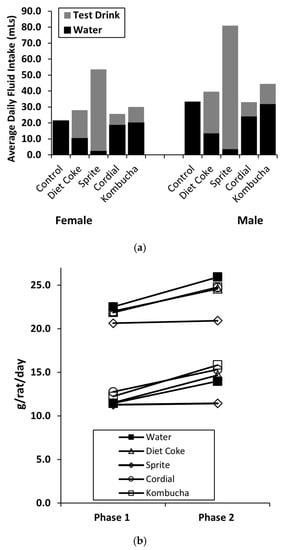 Following the switch from sucrose to NNS, an interesting observation was that the total average daily fluid intake (water plus test drink) for most NNS test drink groups remained higher than in the control group where only water was offered, suggesting a pattern of over-drinking. This was particularly evident in the Sprite group (females: 53.5 ± 1.7 mL/rat/day; males: 81.1 ± 1.3 mL/rat/day) compared to the control group (females: 21.4 ± 0.4 mL/rat/day; males: 33.5 ± 0.4 mL/rat/day) (see Figure 5a). The percentages of test drink contribution to the average daily fluid intake recorded for females and males, respectively, for Diet Coke were 62.5% and 65.8%, 95.1% and 95.6% for Sprite, 26.5% and 27.2% for Cordial, 32.0% and 28.3% for Kombucha.