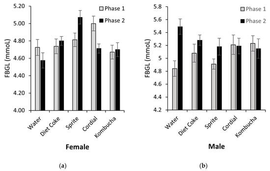 Fasting blood glucose levels are shown in Figure 6. At the end of Phase 1, when all the animals were treated in an identical way, one-way ANOVA analyses confirmed there was no significant difference in FBGLs between the groups (females: p = 0.24; males: p = 0.13). Subsequently, when the rats were switched to the allocated test drinks for a further 28 days (Phase 2), 5 × (2) mixed ANOVA analyses found Group × Phase interactions (females: F(4,35) = 4.71, p = 0.04; males: F(4,35) = 3.31, p = 0.021). In females, further analyses revealed a simple main effect for Group (F(4,35) = 3.99, p < 0.009) and Phase (F(1,7) = 11.46, p = 0.012), with the pairwise comparison identifying the Sprite group had both significantly higher FBGLs than all the other groups in Phase 2 (ps = 0.04) and increased between the tests (p = 0.012). No difference was detected between the latter conditions. Similarly, a simple main effect for Phase was identified in males, with post-hoc analyses finding control (F(1,7) = 14.61, p = 0.007) and Sprite (F(1,37) = 6.91, p = 0.034) FGBL values increased between the tests. No other interactions or effects were detected.