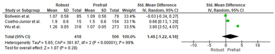 Figure 2 shows the differences in protein intake between prefrail and robust older adults. The pooled analysis indicated that there were no significant differences between groups (SMD = 1.48, 95%CI: −1.22–4.18, p = 0.28).