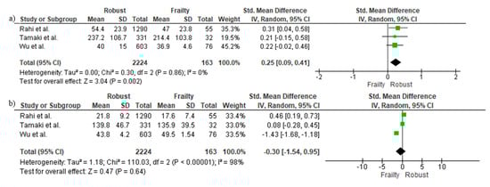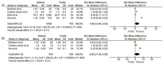 Figure 3 shows the differences in protein intake between frail and robust older adults. The pooled analysis indicated that there were no significant differences between groups (SMD = 1.98, 95%CI: −0.46–4.43, p = 0.11; Figure 3a). Results remained non significant when only studies reporting protein intake adjusted by body weight (BW) were analyzed (SMD = 2.50, 95%CI: −1.38–6.39, p = 0.21; Figure 3b).