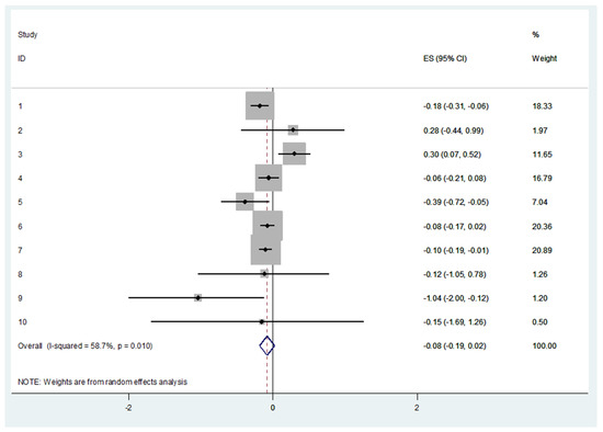 Figure 4 shows the pooled analysis of the 10 studies that investigated the association between protein intake and frailty in older adults. The association was not significant (log10 = −0.082, 95%CI = −0.187–0.023, p = 0.127). Data remained non significant when the analyses were conducted according to protein consumption levels (absolute, adjusted to BW, and percentage of protein relative to total energy consumption).