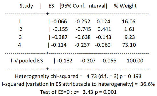 Figure 6 shows the pooled analysis of the four studies that investigated the longitudinal association between protein intake and frailty in older adults. High protein consumption was associated with a significantly lower risk of frailty (log10 = −0.132, 95%CI = −0.207–0.056, p = 0.001).