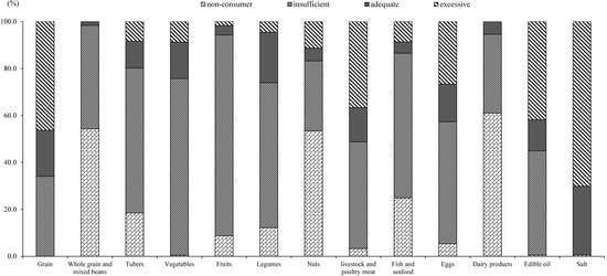 As shown in Figure 1, of all participants, the proportion of subjects with excessive grain intake was 46.3%, while the proportions of subjects with insufficient intake of whole grains and mixed beans, tubers, and legumes were 44.1%, 61.8%, and 61.8%, respectively, and 54.3%, 18.5%, and 12.2% were non-consumers. As regards vegetables and fruits, 75.3% and 85.6% of the population had insufficient intake, 0.5% and 8.7% were non-consumers, and only 15.6% and 4.0% ate adequately, respectively. The proportion of subjects consuming excessive amounts of livestock and poultry meat and eggs were 36.6% and 26.6%, respectively, while 61.6% of subjects consumed fish and seafood insufficiently, with 24.9% being non-consumers. Only 5.4% of subjects had an adequate intake of nuts and dairy products. 41.8% and 70.1% of the subjects consumed edible oil and salt excessively, respectively.