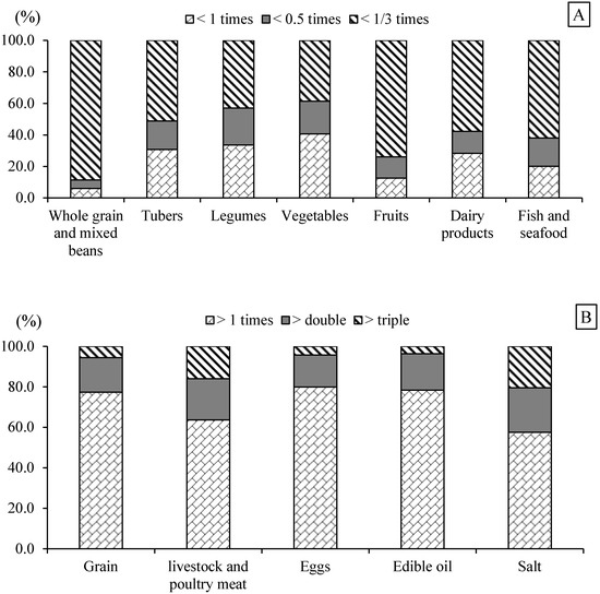 Among the consumers with insufficient or excessive intake, the percentages having an intake less than a third of the recommendation for whole grains and mixed beans, tubers, legumes, vegetables, fruits, dairy products, and fish and seafood were 88.6%, 51.2%, 42.9%, 38.6%, 74.0%, 57.7%, and 62.0%, respectively. The percentages having an intake more than one time the recommendation for grain, livestock and poultry meat, eggs, edible oil, and salt were 77.4%, 63.6%, 79.9%, 78.4%, 57.5%, respectively. 20.4% and 21.9% of the subjects consumed more than twice the recommended quantity of livestock and poultry meat and salt, respectively, and 16.0% and 20.6% consumed more than three times the recommended amount (Figure 2).
