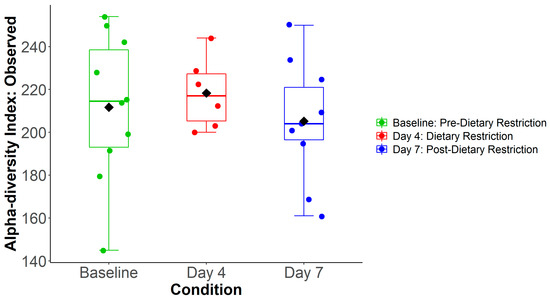 Interestingly, the stDR stimulated these adaptations rapidly, in as few as four days. Also, the microbiome quickly reversed back to its baseline condition within 3 days of resuming a regular, unrestricted diet. This return to baseline occurred regardless of each individual’s baseline diet composition. In a similar fashion, pathway analysis revealed an overlap before and after dietary intervention, although several degradation pathways were elevated on Day-7. Therefore, resuming a nutrient-dense diet allows for biosynthetic processes to resume while breakdown processes continue to function, with a slower return to baseline. Considering dietary restriction as a pre-operative conditioning strategy, it is essential to know that rapid, reproducible changes are possible in a short period of time in order to maintain patient compliance. Similar to our results, David et al. also showed that diversity metrics could be altered after four days of an animal-based diet and return to baseline within five days of stopping the diet [87]. Also, Wu et al. found that composition changes are seen even as early as the first day of dietary intervention [56].